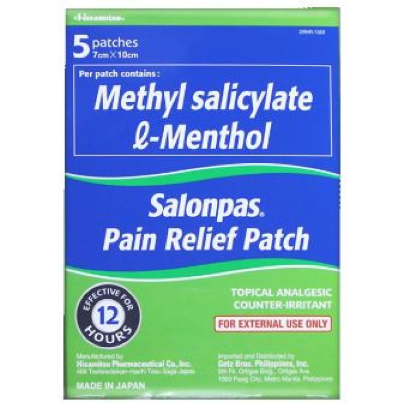 Salonpas Pain Relief Patch is indicated for the temporary relief of minor aches and pains of muscles and joints associated with simple backache, arthritis, strains, bruises, and sprains.